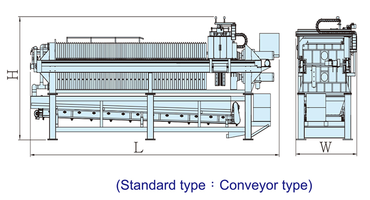| Model | Filter plate size & quantity (Chamber + Membrane plate type) (mm/piece) | Filter area (M2) | Treating capacity (Sludge cake volume) (Liter/Lot) | Ref. Machine dimension