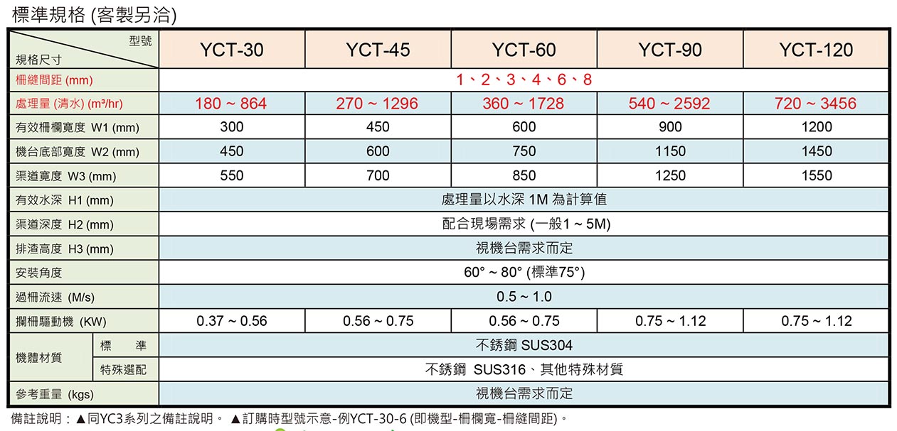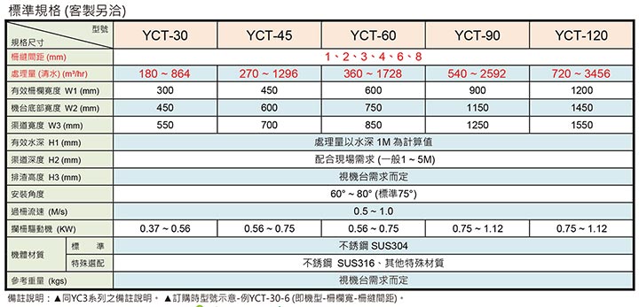 備註說明: *同YC3系列之備註說明。 *訂購時型號示意-例YCT-30-6 (即機型-柵欄寬-柵縫間距)。 |