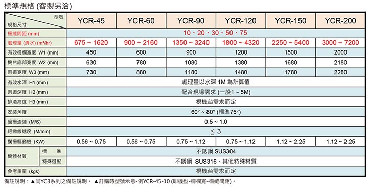 備註說明: *同YC3系列之備註說明。 *訂購時型號示意-例YCR-45-10 (即機型-柵欄寬-柵縫間距)。 |