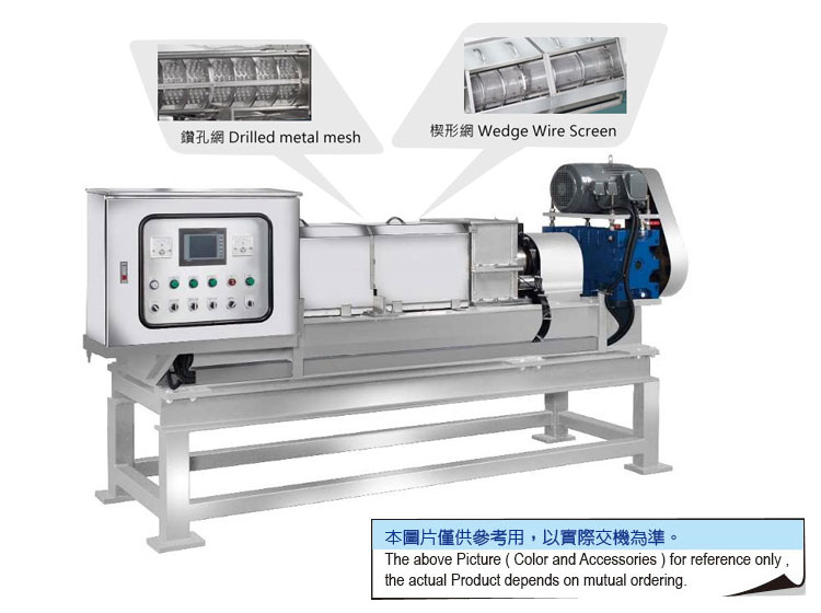 ⒶScrew rod outer diameter with tungsten carbide and hard chrome plating screw rod compression ratio designed by the geometric changes of it’s physical properties of the treated material, high transport efficiency of extrusion, abrasion resistance and long service life. ⒷDouble thrust bearing centralized face to face design, machine reaction force uniform, may increase bearing life and no vibration, no abnormal noise, direct drive of reducer and screw rod, with high torque and transmission efficiency. ⒸTapered hole in the outer filter design with high drainage rate, low clogging. ⒹThe feeding hopper, support net, filter net and discharged hopper are two haves designed, easy maintenance and installation, small disassembling job area. ⒺElectric control with touch human-machine interface, user operation, the historical data record, the parameters setting are user-friendly design. ⒻBack pressure ring made from engineering plastic, long life and low friction, three point support cylinder pressed, stable output with high solid content’s rate.。 |