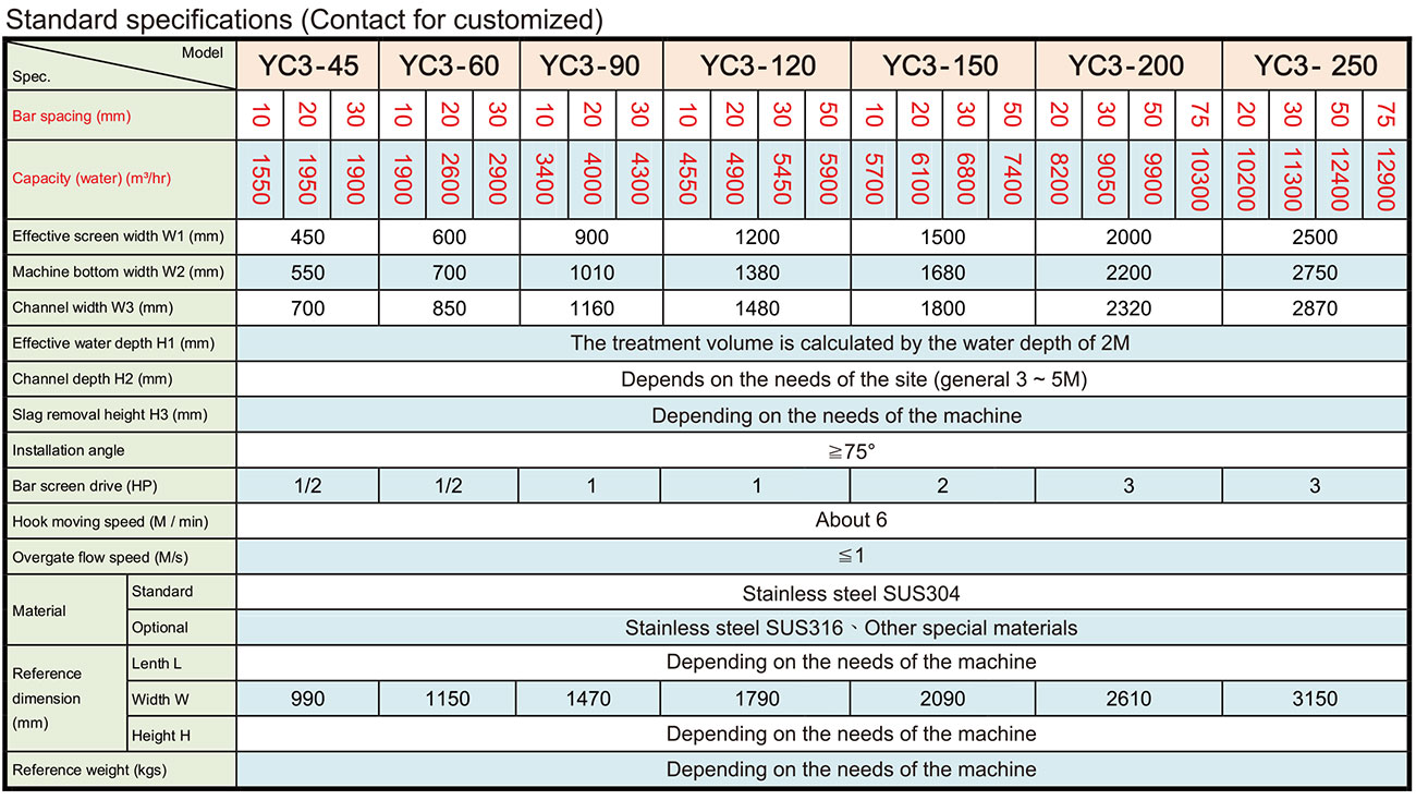 замечание: * Перечисленные выше данные могут быть процессе на месте и условиях качества воды. * Размер Заборы и мощности различных видов выбрать, пожалуйста, свяжитесь с отдельно. * Таблица мощности сила канала, когда глубина меньше 10M, 10M с течением времени, чтобы повысить уровень питания не требуется. * Клиент должен предоставить при заказе следующие параметры: ширина канала, глубина канала, угол установки, ворота совместной расстояния, высоты шлакового, самом высоком уровне. * При заказе принципиальную модель - пример YC3-90-100 (т.е. модели - ширина забора - ворота совместное расстояние). * Технические характеристики вне принятому порядку, Компания оставляет за собой право вносить конструктивные изменения. * Пожалуйста, обратитесь к фактической измерения перед заказом. |